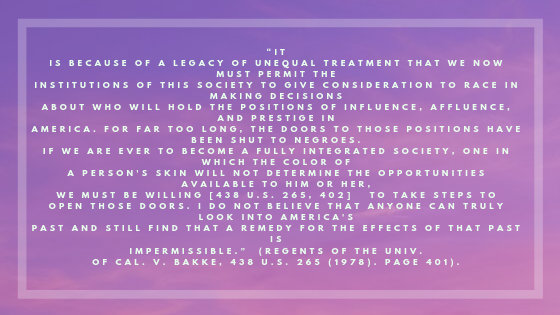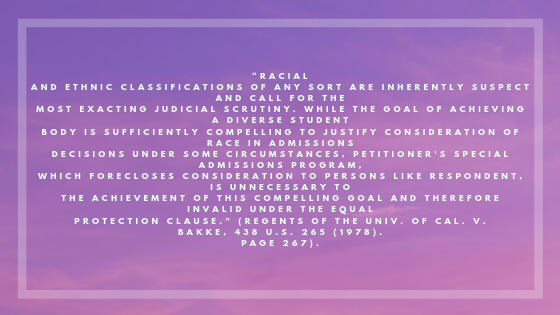 As food for thought, I would like to offer a critique of university spaces, which are not neutral in this issue. While of course, in this example, the university was fighting for diversity and inclusion, it is important to note that the university is a product of mass American institutions, like those of incarceration. That being said, it is important to be aware of the way inclusion is a benefit to the institution itself, and the way power is being used and remolded to maintain its leverage throughout changing times. Histories of inclusion have prompted institutional reframing that shifts power, but never gives it away. So, while this case did not provide recourse for those who needed it and who have suffered at the hands of violence and complacency alike, the university also needs to distribute resources and access to communities that need it. I wonder how the university, because of their stake in this case, is also complacent in not addressing histories and legacies of managing difference, perpetuation violence and deploying technologies of exclusion.
